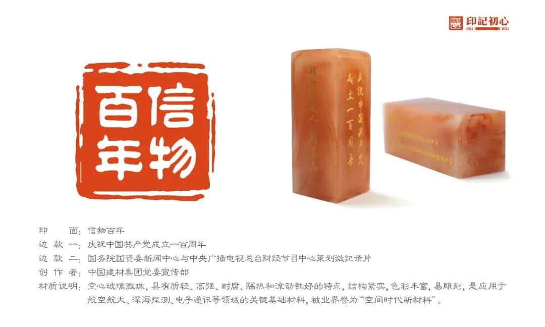 印章意义:在中国共产党成立一百周年之际,国务院国资委新闻中心联合中央广播电视总台共同推出百集微纪录片《信物百年》,以 “红色信物”为切入点,由以中央企业为代表的100家企业党委(党组)负责人介绍企业的传家宝,以小见大,以物证史,揭开企业澎湃发展历程背后鲜为人知的故事,见人、见物、见精神,发扬红色传统、传承红色基因。